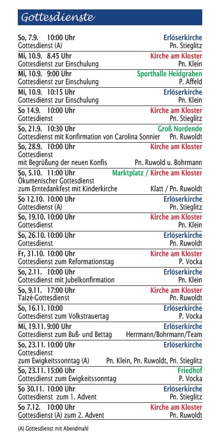 Prinzipiell findet jeden Sonntag, meistens um 10 Uhr ein relativ traditioneller Gottesdienst statt. Natürlich feiern wir auch besondere Andachten und Gottesdienste, diese auch gerne mal zu anderen Zeiten und/oder an anderen Orten. Zu allen Zeiten und an allen Orten sind Sie herzlich bei uns willkommen.